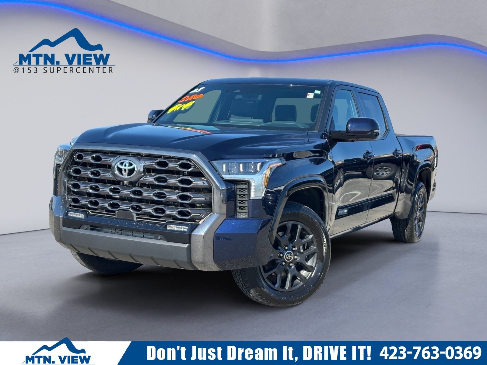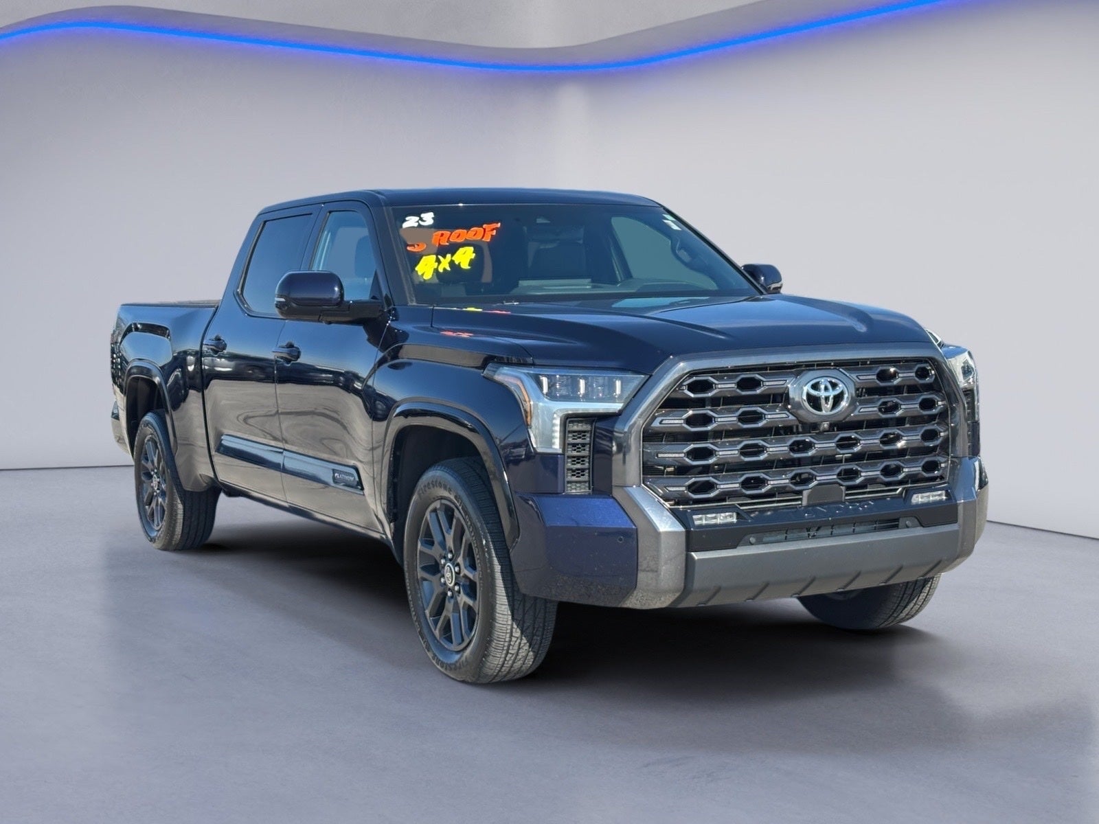 Bluetooth®, Hands Free Phone, Service Records Available, Fully Detailed, We have all of your financing needs covered. Ask us how to get pre-approved today!, Tundra Platinum, 4D CrewMax, 3.4L V6, 10-Speed Automatic, 4WD, Blue, Black w/Leather Seat Trim, 10-Way Pwr Adj Heated and Ventilated Front Seats, 12 Speakers, 3.31 Axle Ratio, 4-Wheel Disc Brakes, ABS brakes, Air Conditioning, Alloy wheels, AM/FM radio: SiriusXM, Apple CarPlay/Android Auto, Auto High-beam Headlights, Auto-dimming door mirrors, Auto-dimming Rear-View mirror, Automatic temperature control, Brake assist, Bumpers: body-color, Delay-off headlights, Driver door bin, Driver vanity mirror, Dual front impact airbags, Dual front side impact airbags, Electronic Stability Control, Emergency communication system: Safety Connect (10-year trial), Front anti-roll bar, Front Bucket Seats, Front Center Armrest, Front dual zone A/C, Front fog lights, Front reading lights, Front wheel independent suspension, Fully automatic headlights, Garage door transmitter: HomeLink, Heated door mirrors, Heated front seats, Heated rear seats, Heated steering wheel, Illuminated entry, Knee airbag, Leather Seat Trim, Leather Shift Knob, Low tire pressure warning, Memory seat, Navigation System, Occupant sensing airbag, Outside temperature display, Overhead airbag, Overhead console, Panic alarm, Passenger door bin, Passenger vanity mirror, Power door mirrors, Power driver seat, Power moonroof, Power passenger seat, Power steering, Power windows, Radio data system, Radio: Audio Multimedia System, Rain sensing wipers, Rear reading lights, Rear seat center armrest, Rear step bumper, Rear window defroster, Remote keyless entry, Safety Connect, Security system, Speed control, Speed-sensing steering, Split folding rear seat, Steering wheel memory, Steering wheel mounted audio controls, Tachometer, Telescoping steering wheel, Tilt steering wheel, Traction control, Trip computer, Turn signal indicator mirrors, Variably intermittent wipers, Ventilated front seats, Ventilated rear seats, Voltmeter, Wheels: 20 Dark Painted Alloy, Tundra Platinum, 4D CrewMax, 3.4L V6, 10-Speed Automatic, 4WD, Blue, Black w/Leather Seat Trim.